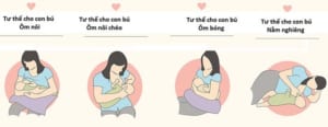 - Đầu bé nằm trên cánh tay mẹ, mặt hướng về vú